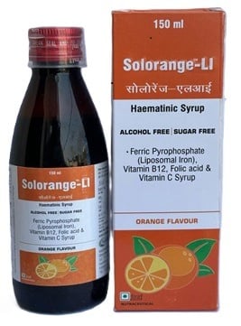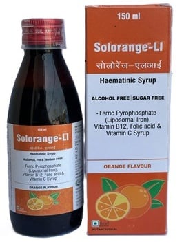 Solorange-LI Syrup is iron formulation in the form of Liposomal Iron containing ferric Pyrophosphate citrate, folic acid, vitamin-C & Vitamin B12. That is indicated for the treatment of Iron Deficiency Anemia & Chronic Kidney Disease (CKD).