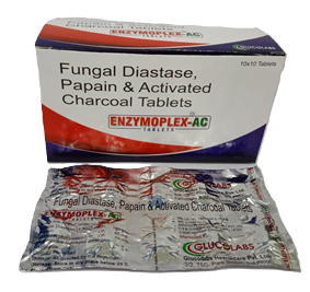 Enzymoplex-AC tablet is the combination of Fungal Diastase, Papain and Activated Charcoal also called as Carbon that has been processed to make it extremely porous thus to have a very large surface are available for absorption or chemical reaction. Charcoal is a bio active form of Activated Charcoal to treat the gastrointestinal problems such as indigestion, flatulence, and abdominal discomfort.